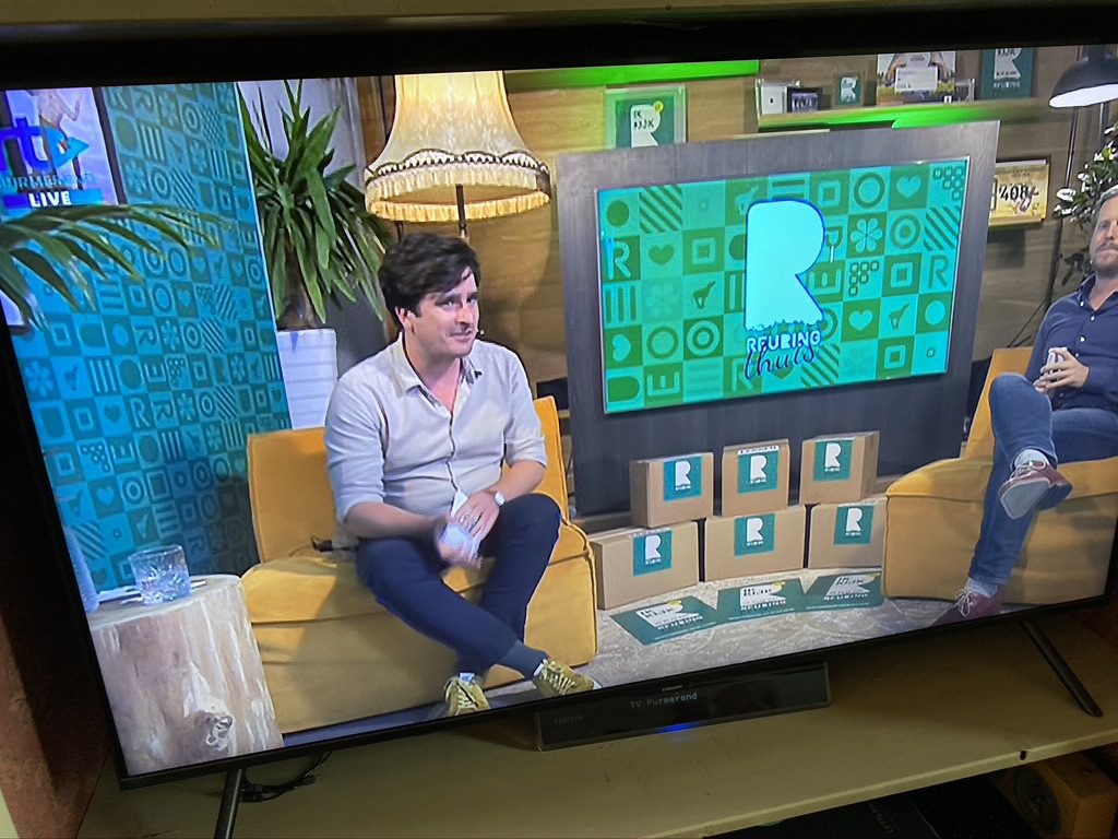 Vanuit je luie stoel Advertentie programma en actieposter tegelijk Talkshow vanuit de Reuring Studio Het Reuring Thuis Festival pakket.